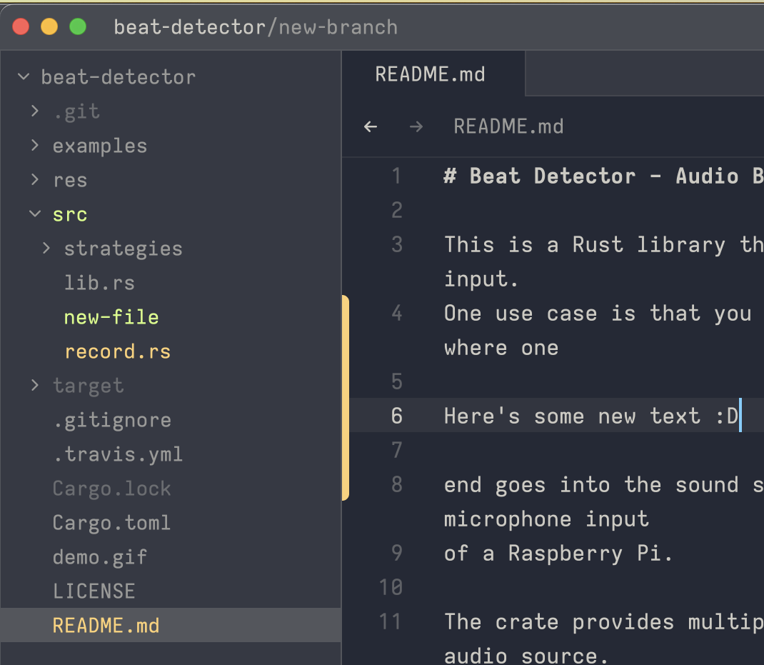 This month, I'm integrating information from your git repositories into Zed. Last week we reworked our in-memory representation of the repository state so we can sync it over the wire, using branch name detection as a motivating use case. This week that approach has been expanded to add a live view of the current git status for each file in your project. Here's a screenshot of the current implementation: